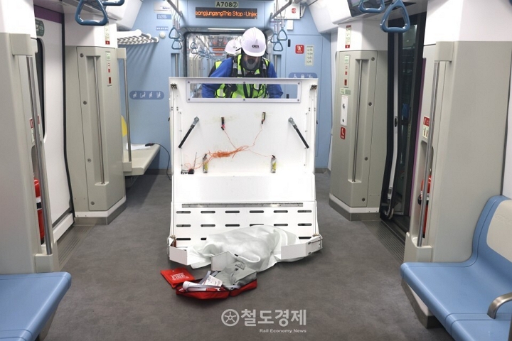 지난 25일 지티엑스에이운영은 파주운정역에서 열차 내 PM(전동휠) 배터리 화재 비상대응 종합 훈련을 실시했다. 이날 훈련에는 PM 화재 진압 전용 설비(Fire Cube)를 활용했다. 이 설비는 화재가 난 PM을 옮기는 포획틀, 화재를 진압할 수 있는 함체(냉각수조) 등으로 구성돼 있다. 소방기관 도착 전 GTX-A운영 초기대응팀이 객실 내 화재가 난 PM을 수거장비(포획틀)를 이용해 옮기고 있다. 2025.11.28 / 철도경제