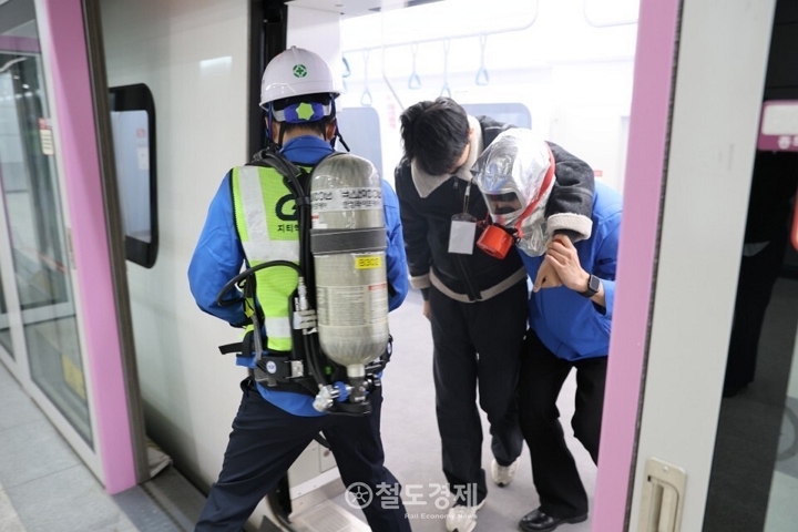 이날 훈련은 오전 10시 42분경 킨텍스역을 출발해 운정중앙역으로 이동 중인 열차 1호차 객실 내부에서 개인이동장치(PM) 배터리 화재가 발생한 상황을 가정했다.