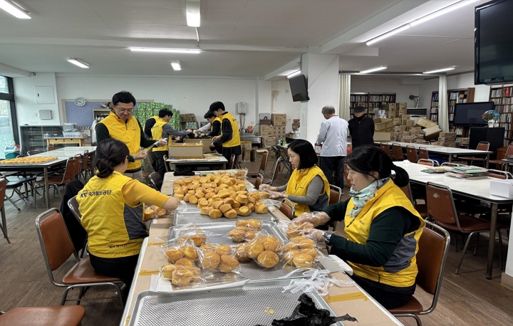 건설본부 사내 봉사단이 11일(목) 은총섬김회를 방문해 취약계층 전달용 빵 및 생필품을 포장하고 있다.