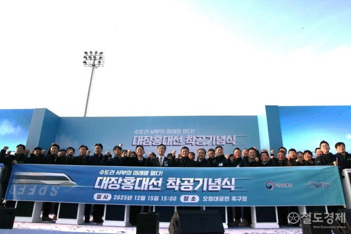 15일 오후 부천 오정대공원에서 열린 '대장홍대선 착공식' 현장에서 현대건설 관계자들이 기념 사진을 촬영하는 모습. 대장홍대선은 현대건설 컨소시엄(서부광역메트로)가 민간투자사업으로 추진한다. 25.12.15 / 철도경제
