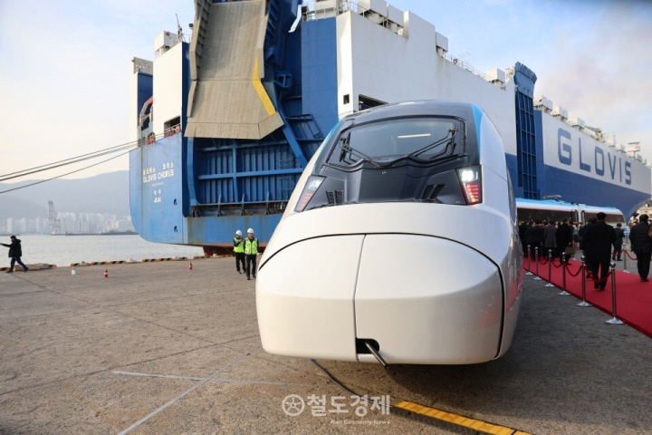 현대로템은 10일 경남 창원시 마산항에서 '우즈베키스탄 고속열차 출항식'을 가졌다. 사진은 마산항에 있는 우즈벡 수출 고속열차. 2025.12.10 / 철도경제