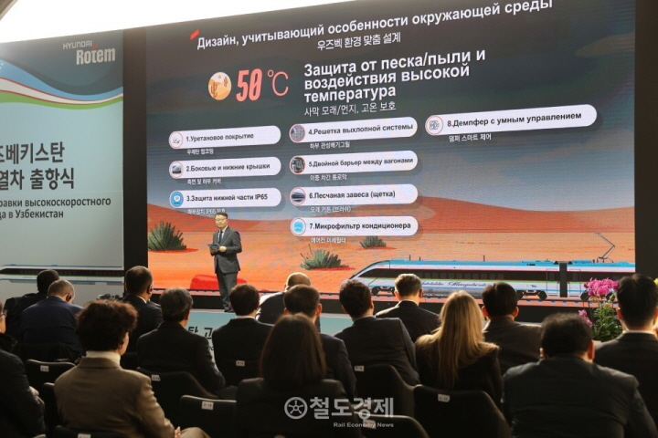 이날 행사에서 이원상 CTO는 "우즈벡 고속열차는 7번째 동력분산식 상용화 사업으로 한국 고속열차 제작 노하우가 반영된 최신형 차량"이라며 "이미 국내서 검증된 KTX-이음 모델을 개량해 현지 환경에 맞게 성능을 보완했다"고 설명했다.