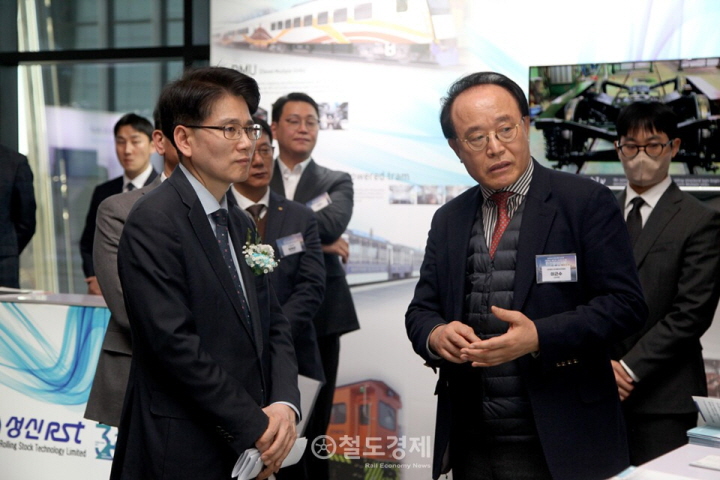 김태병 국토교통부 철도국장(오른쪽)이 박계출 성신RST 대표이사와 성신RST 부스를 살펴보고 있다. 2026.1.22 / 철도경제
