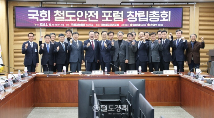 11일 국회의원회관 제1세미나실에서 국회 철도안전포럼 창립총회를 개최했다. 참석한 내·외빈들이 기념촬영을 하고 있다. 2026.2.10 / 철도경제
