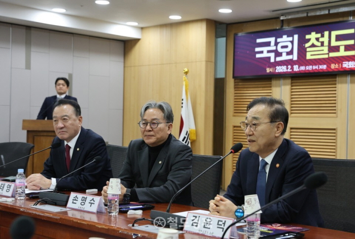 11일 국회의원회관 제1세미나실에서 국회 철도안전포럼 창립총회를 개최했다. 사진 왼쪽부터 엄태영 의원, 손명수 의원, 김윤덕 국토부 장관. 2026.2.10 / 철도경제
