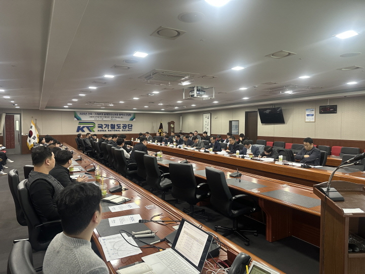 국가철도공단 SE융합본부 직원들과 13개 협력사 관계자들이 17일(목) 대전 본사에서 ‘2026년 건축·기계분야 설계 엔지니어링 협력사 간담회’를 진행하고 있다.
