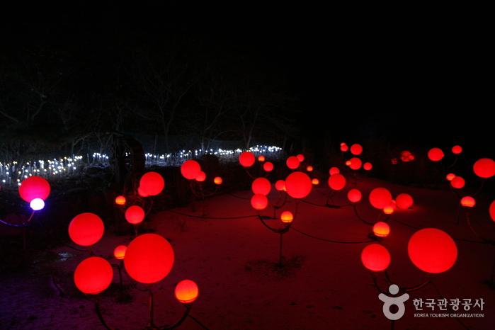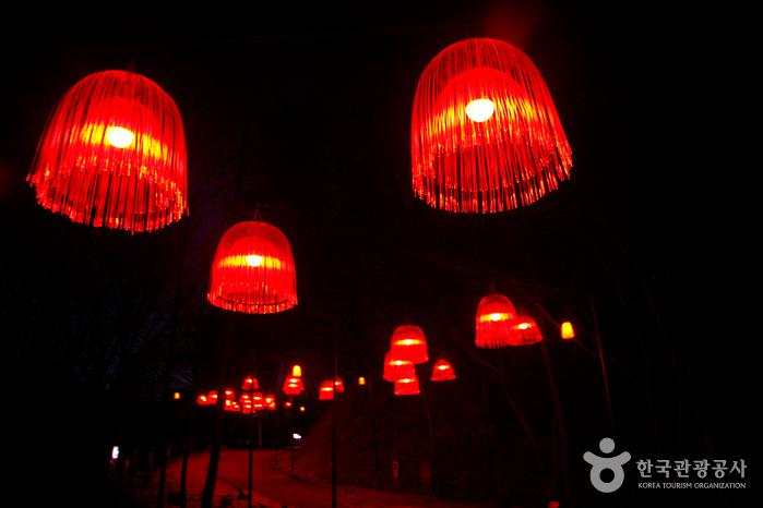 선율이 흐르는 밤의 숲을 거니는 것은 몽환적이다. 빛과 조명으로 단장한 나무와 숲길은 겨울밤을 고요한 감동으로 채색한다. 원주 오크밸리의 ‘소나타오브라이트(빛의 소나타)’는 숲속에서 펼쳐지는 빛과 음악의 쇼다. 참나무 숲 1.4km 구간에서 빛과 선율에 매료된 채 야간 산책을 즐길 수 있다. 숲속을 헤엄치는 야광 해파리, 골프장 위를 유영하는 대형 고래 등을 산책로에서 만난다.
