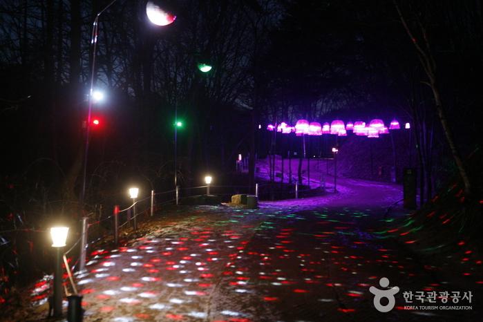 조각공원과 매표소를 지나 오르막길을 오르면 은은한 선율이 시작된다. 달빛의 안단테는 연꽃 연못이던 곳을 달 모형으로 채웠다. 잔잔한 리듬에 따라 동그란 조형물의 색이 변하며 소나타의 서막을 알린다. 반딧불의 알레그레토에서는 반딧불이가 춤추듯, 빛으로 치장된 나무 산책로 따라 빠른 음악이 흐르며 다람쥐 등 동물 조형물을 만난다.