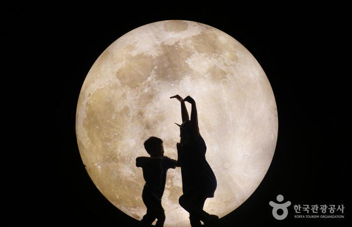 ▲‘힐링의 아다지오’ 보름달 조형물 앞에서 포즈를 취한 아이들