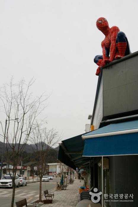 ▲간현벽화거리 편의점 간판에 올라앉은 스파이더맨