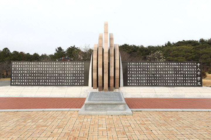 왕인박사의 소통과 상생의 정신을 세계 평화의 디딤돌로 삼고자 한국, 일본, 중국 3국 1,000명의 명사들에게 천자문 한 글자를 배정하여 육필로 작성하여 탁본한 뒤 영암의 석공이 돌에 새겨 만든 뜻깊은 조형물이고요.